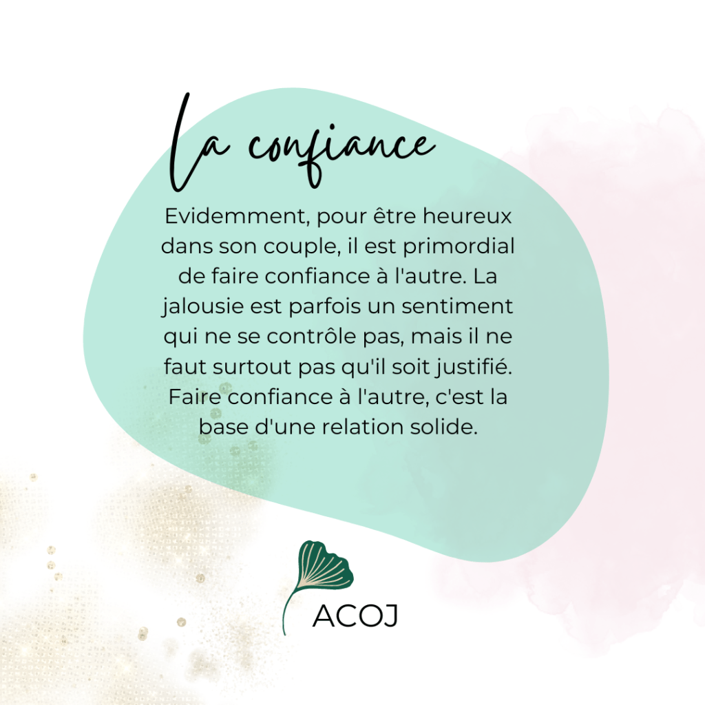 Évidemment, pour être heureux dans son couple, il est primordial de faire confiance à l’autre. La jalousie est parfois un sentiment qui ne se contrôle pas, mais il ne faut surtout pas qu’il soit justifié. Faire confiance à l’autre, c’est la base d’une relation solide.